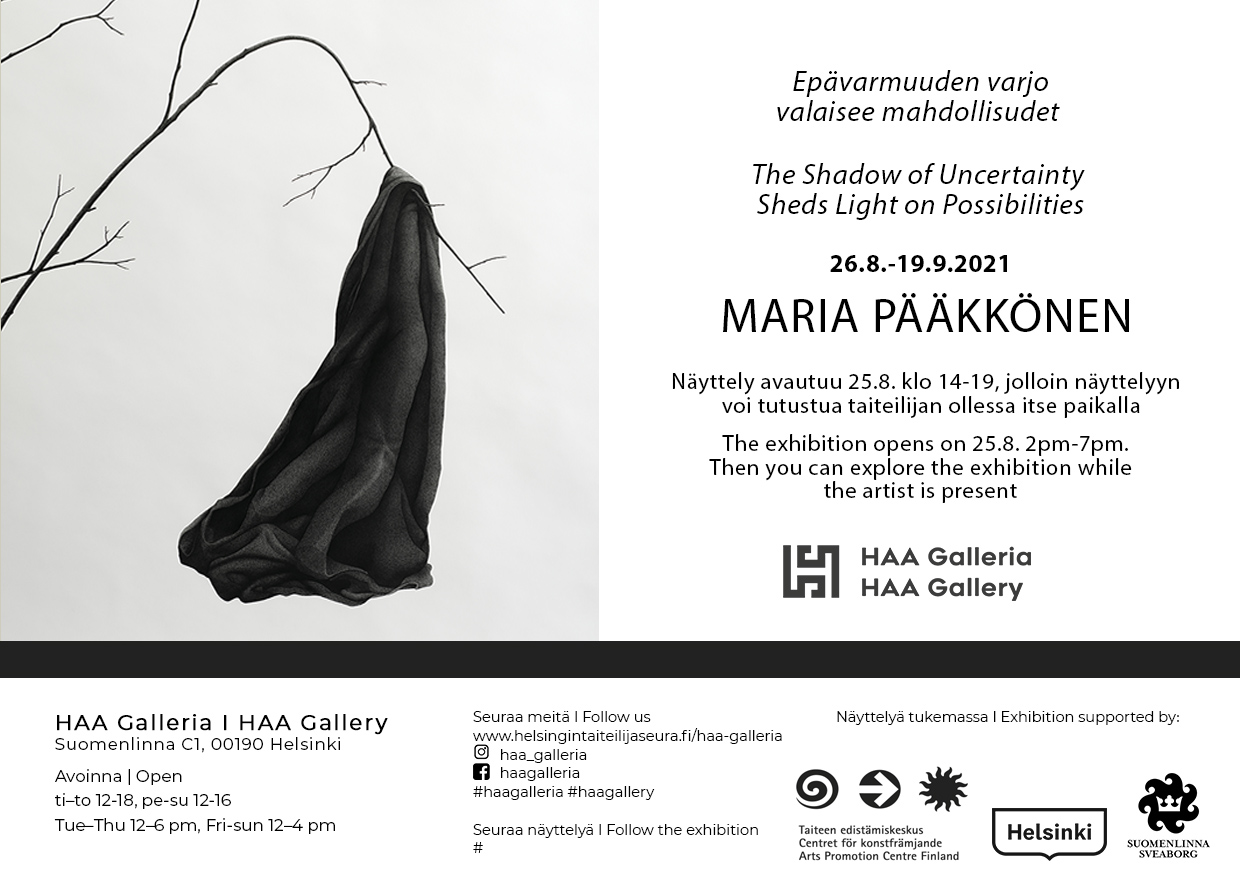 Maria Pääkkösen näyttelyssä Epävarmuuden varjo valaisee mahdollisuudet pääosassa ovat hauraat rakennelmat ja yhteen sulautuvat vaivihkaiset tapahtumat, joiden alkupistettä on vaikea määrittää. Hitaiden muutosten kehittyessä yksittäinen pieni asia voi lopulta laukaista arvaamattoman, kaiken raiteiltaan suistavan ketjureaktion. Näyttely koostuu viiden suurikokoisen lyijykynäpiirustuksen sarjasta, joiden tekotapa mukailee hitauden ja jatkuvuuden teemaa.