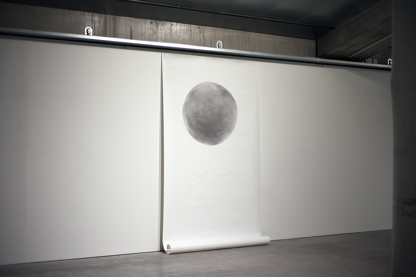 During the drawing process everything is vivid and present in that moment. The scale challenges the physics and dimensions of the body: constant reaching out, moving back and forth again and again, rubbing the charcoal deep inside the surface of the paper and polishing the graphite pigment with a heavy stone. So arise those landscapes that belong to another world that slips away and flows through the fingers somewhere foggy and dark, to distant memories, to the sounds of water and its flickering reflections. While drawing, the materials transform, places change and the story slowly takes its shape.