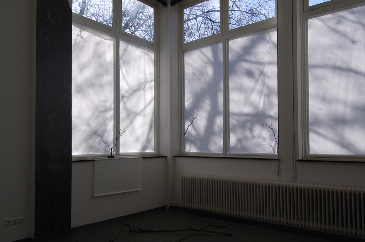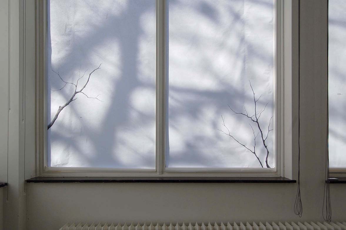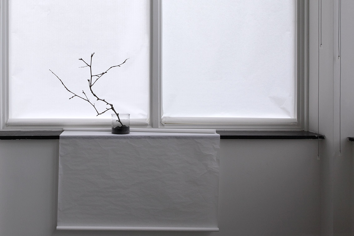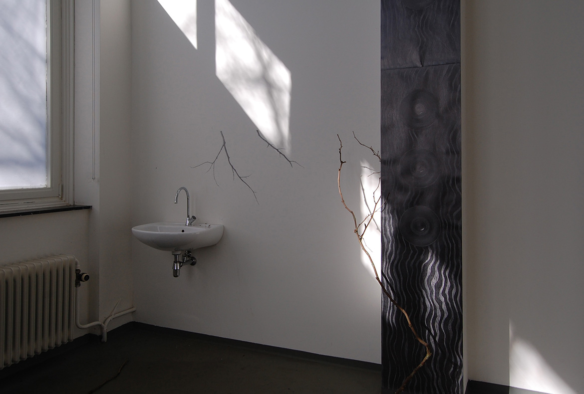 van Eyck Open Studios, Jan van Eyck Academie, Maastricht, Netherlands, 2017. Site-specific drawing installation, pencil on the wall, paper and Japanese paper, glass vase with graphite, branches. Photos: Romy Finke and Eun Lee