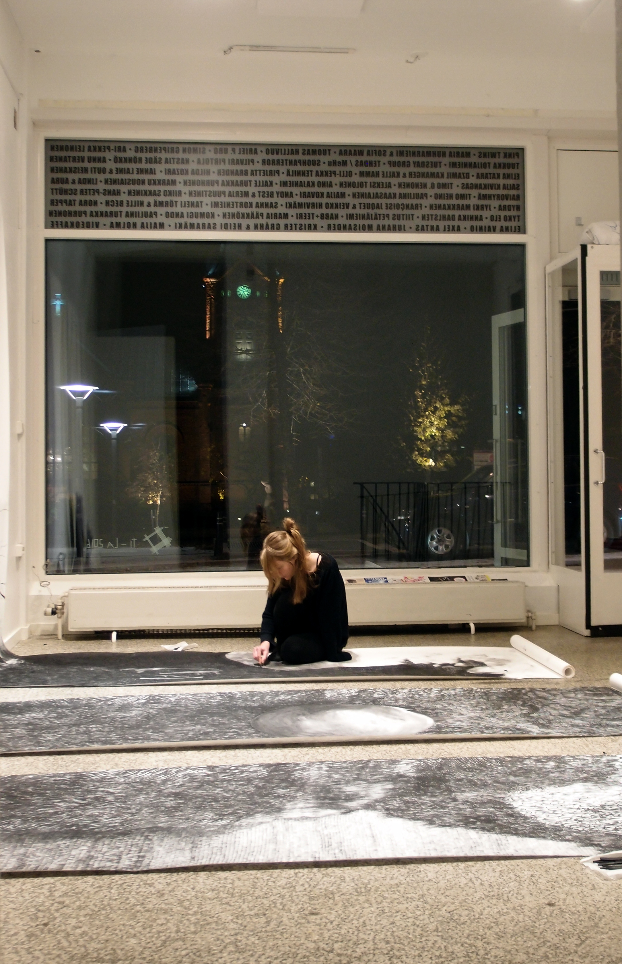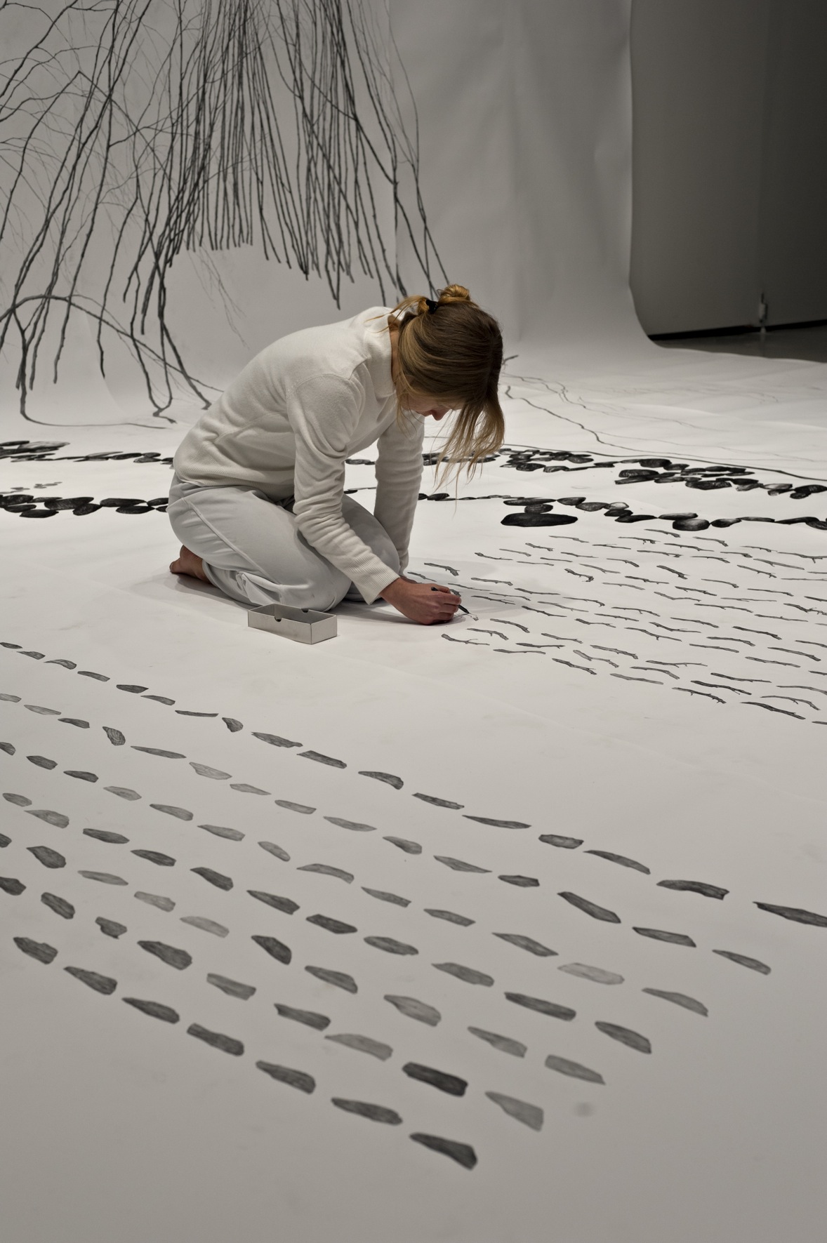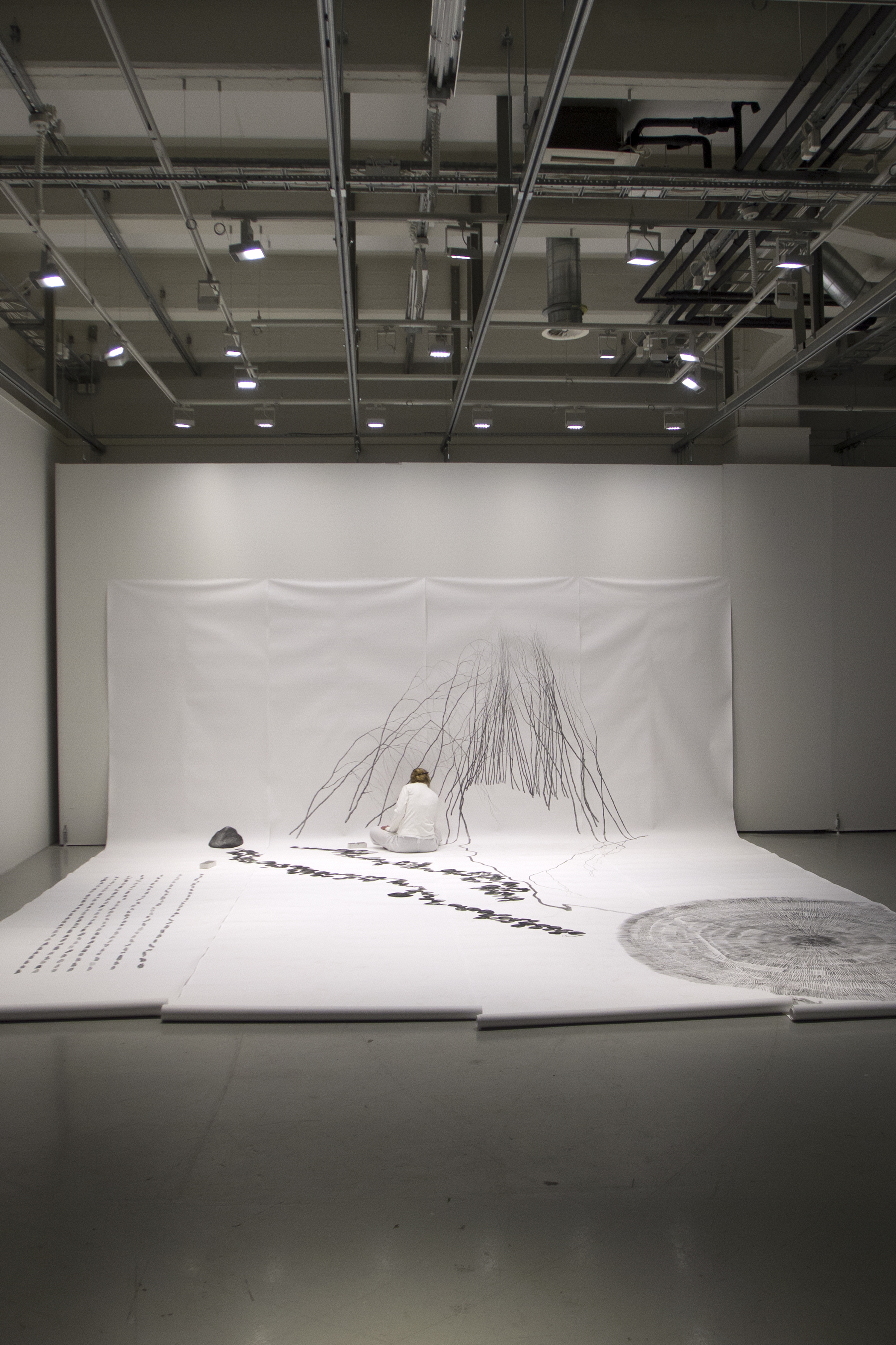 Durational drawing performance (20 days)/ live drawing, pencil and charcoal on paper. Kuva/Tila (Exhibition Laboratory), The Finnish Academy of Fine Arts, Helsinki, FI, 2014.