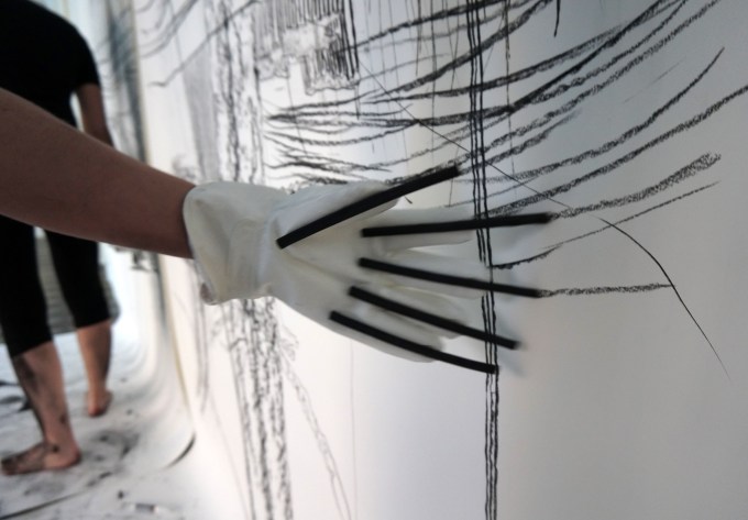 Drawing can mean many things, it can be simply making a line or any kind of mark or trace with pencil, charcoal, body and pigment, or it can be just movement, drawing invisible lines in the space with the body. Drawing can also take different forms what comes to the rhythm and change from slow and concentrated to faster and more dynamic.